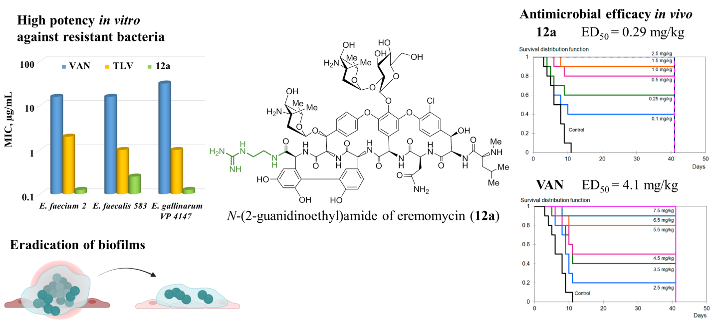 2. E.I. Moiseenko, L.N. Lysenkova, A.S. Gostev, N.E. Grammatikova, E.B. Isakova, E.R. Pereverzeva, G.V. Zatonsky, G.Batta, R.P. Erdei, A.S. Tikhomirov, A.E. Shchekotikhin, N-(ω-Guanidinoalkyl)amides of Eremomycin: New Type of Glycopeptides with High Potency against Planktonic Forms and Biofilms of Resistant Bacteria, ACS Infectious Diseases 2026, 12, 4, 1338–1349, https://doi.org/10.1021/acsinfecdis.5c01004