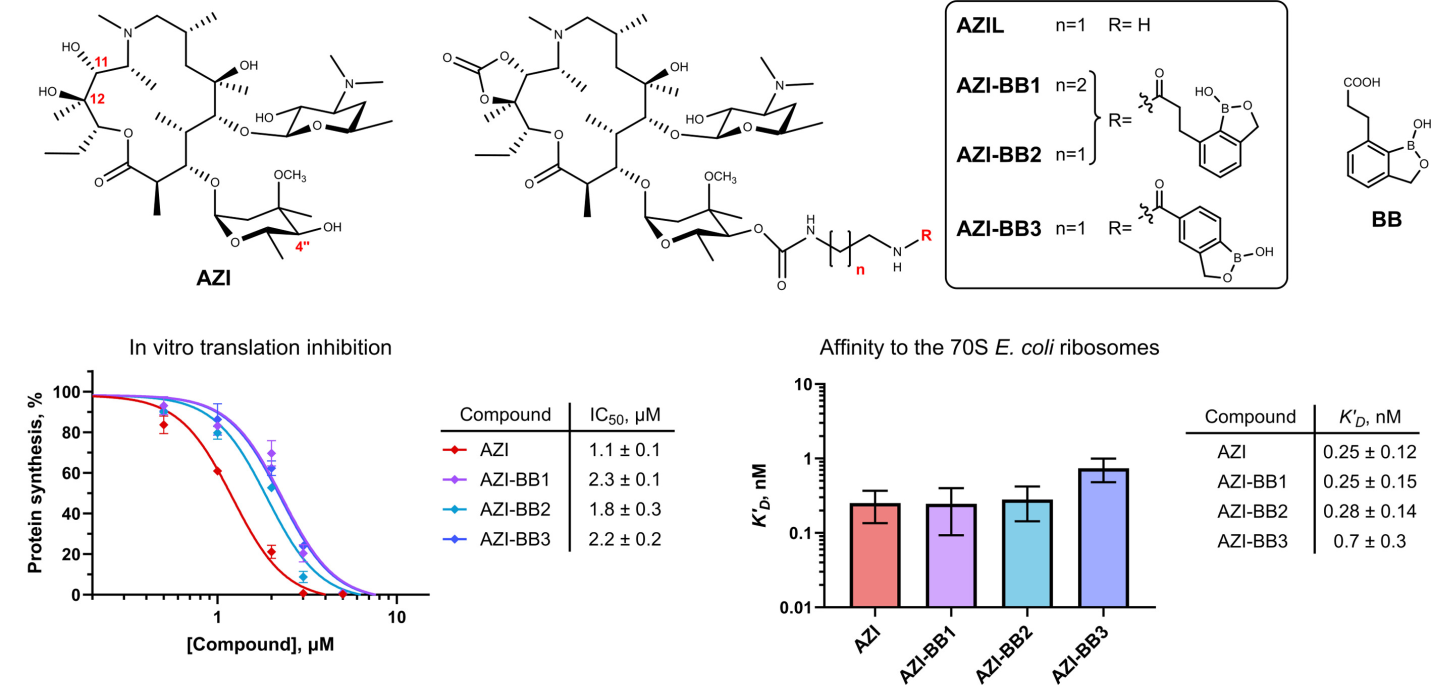 3. I.A. Volynkina, M.O. Bortyazh, C. Chen, A.G. Tereshchenkov, A.O. Karakchieva, D.A. Lukianov, E.S. Komarova, A.E. Tupikin, D.A. Skvortsov, A.N. Tevyashova, A.S. Tikhomirov, V.N. Tashlitsky, M.R. Kabilov, A.E. Shchekotikhin, O.A. Dontsova, Y.S. Polikanov, P.V. Sergiev, Benzoxaborole-modified azithromycins inhibit translation without inducing ermC expression. Antimicrobial Agents and Chemotherapy 2026, 0:e01539-25, https://doi.org/10.1128/aac.01539-25